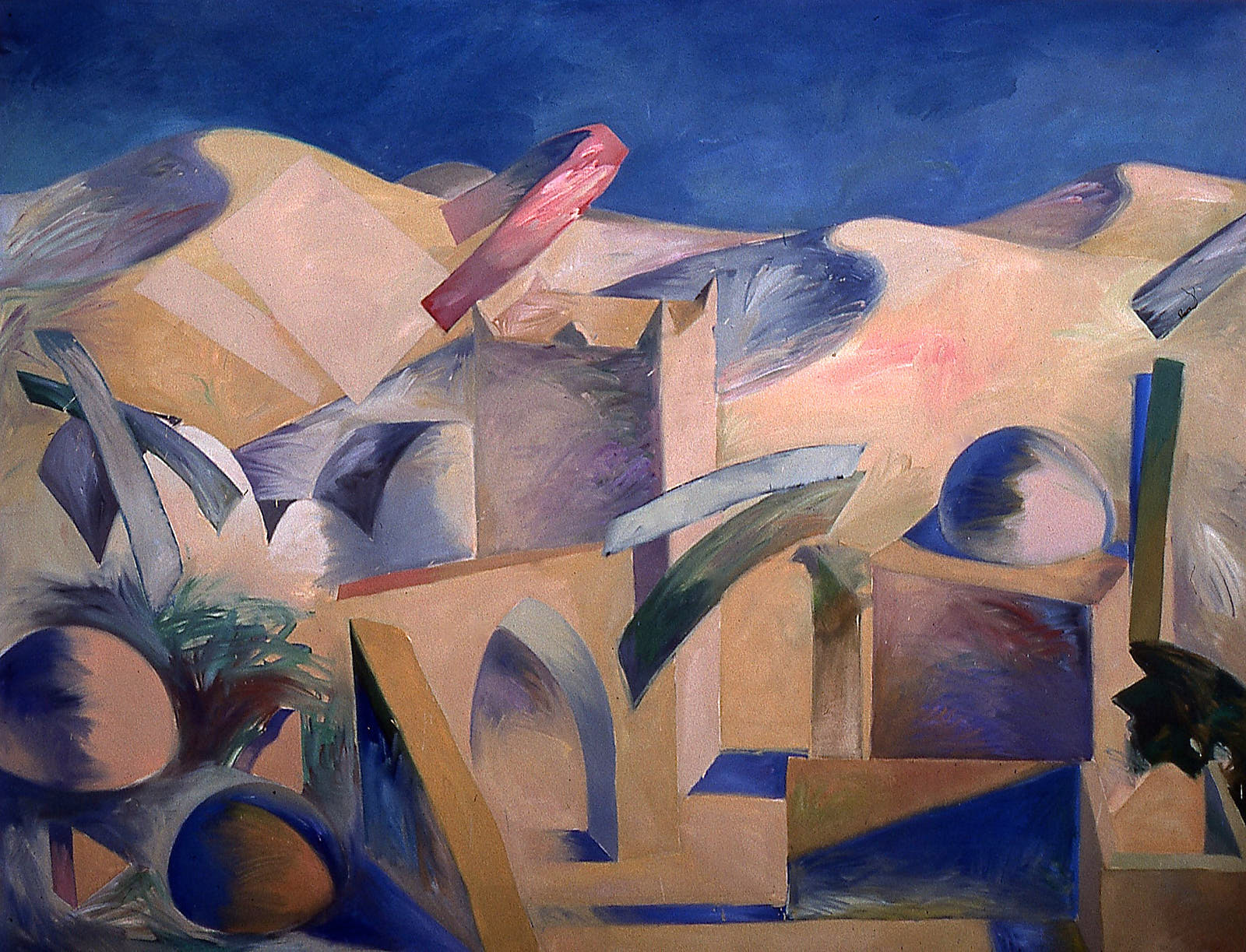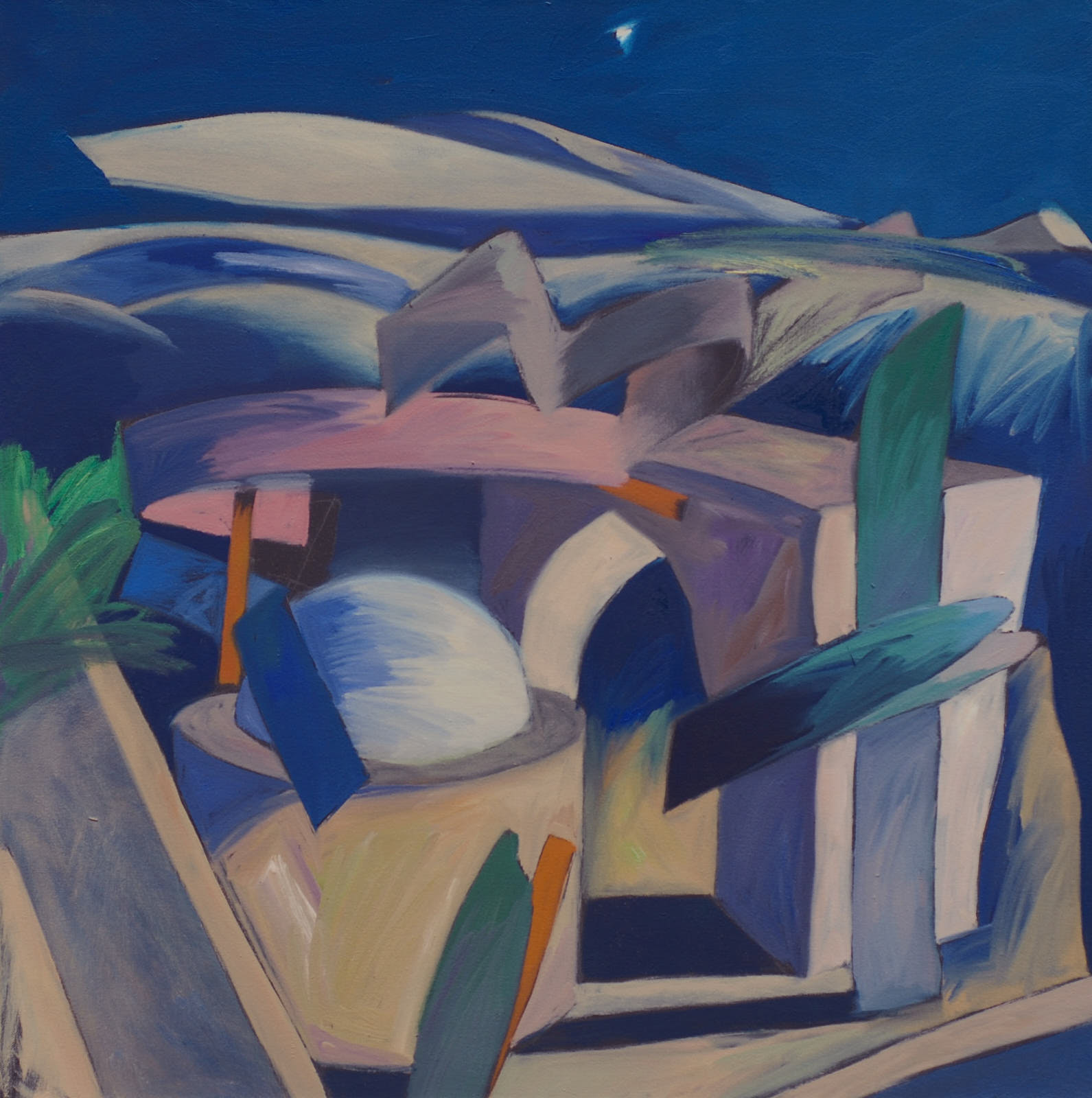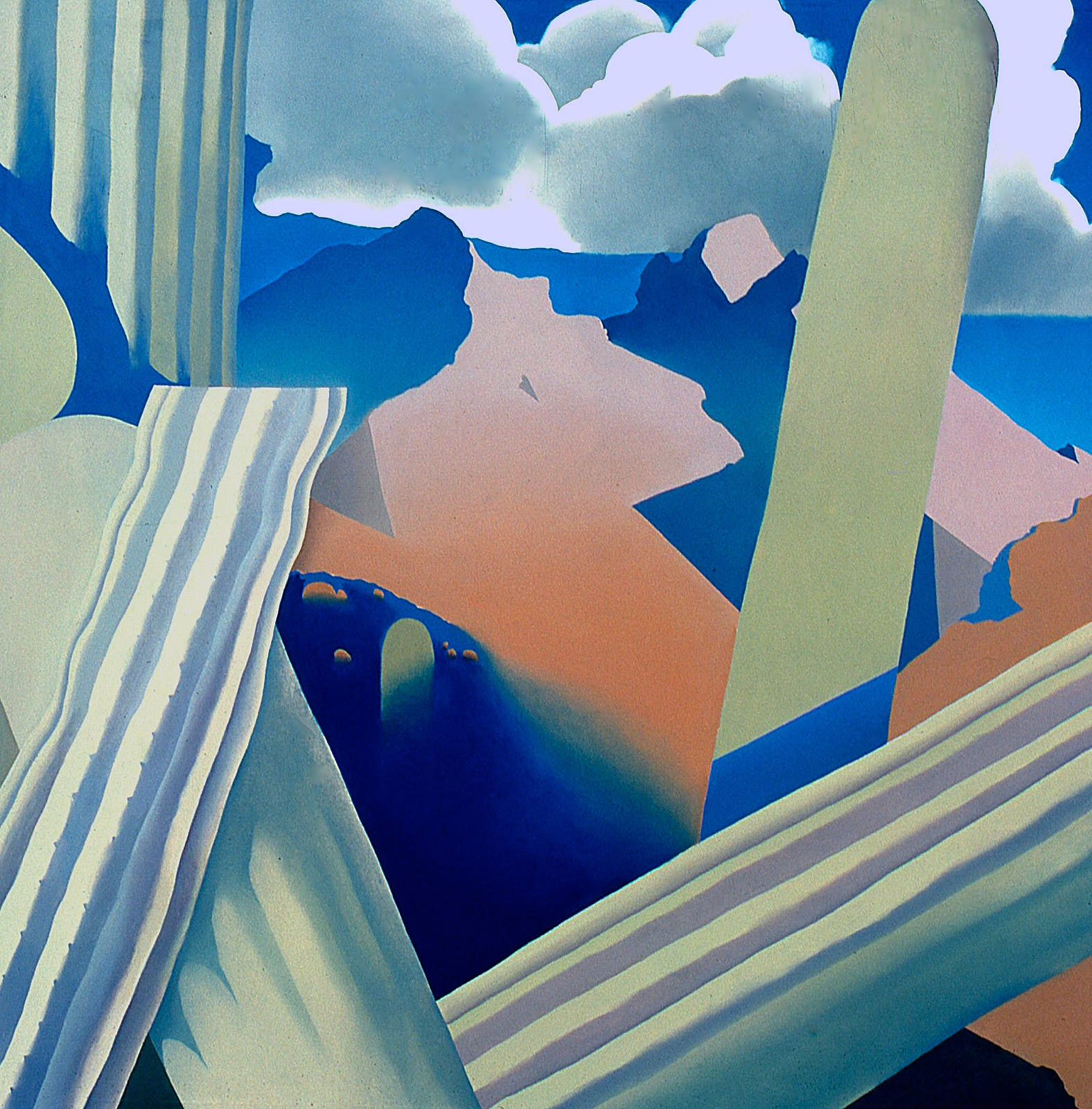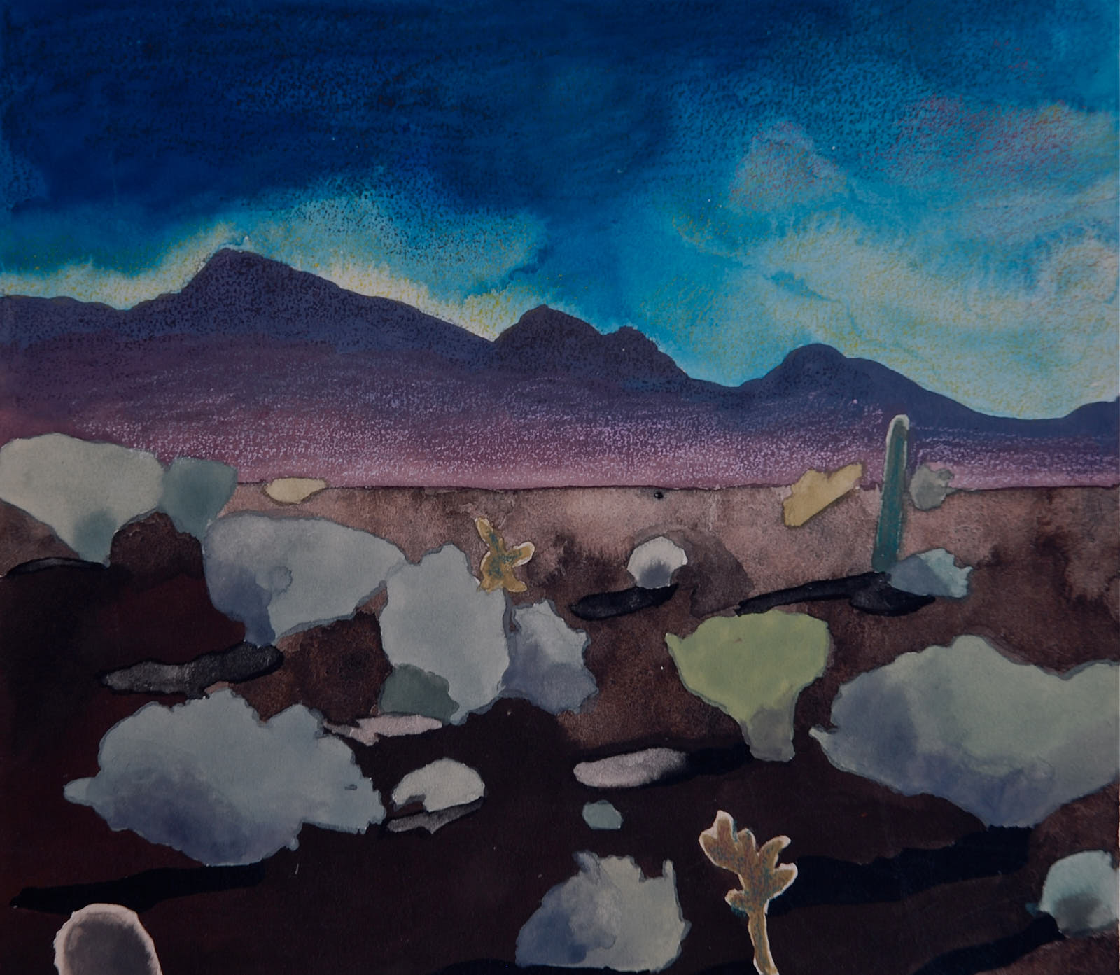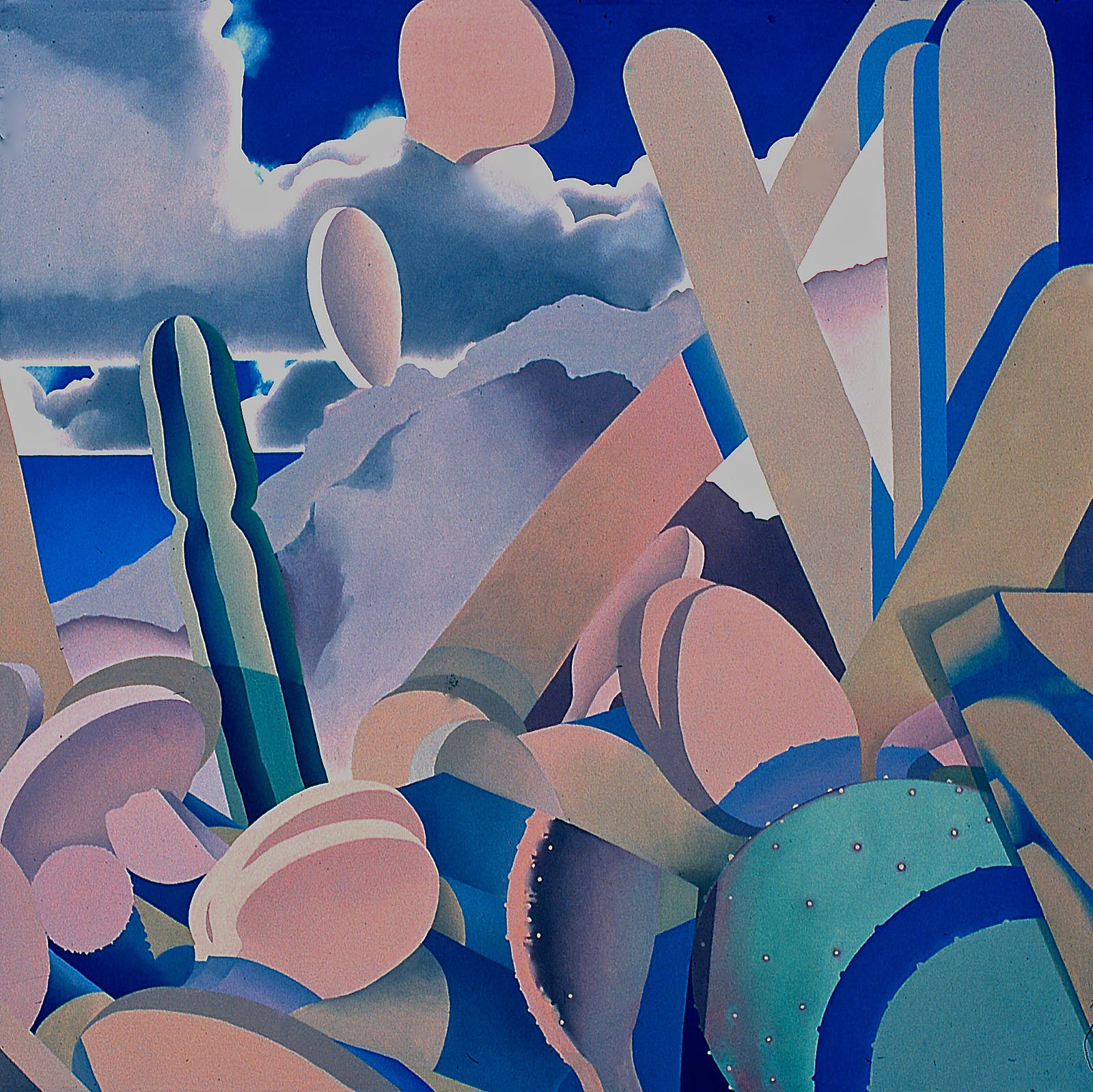 “His earliest landscapes are pictures from the West Coast made during Shank’s time living in San Francisco. Interested in perspective and spatial considerations, these works reflect nuances of location that are fragmented and abstract in presentation. Shank’s signifiers become more literal overtime, as his interest in the form of nature (specific flora and fauna) and cubism become increasingly evident in ‘San Francisco Bay with Iceplant’ (1972) and ‘The Sonora Desert at Ajo’ (1973).”