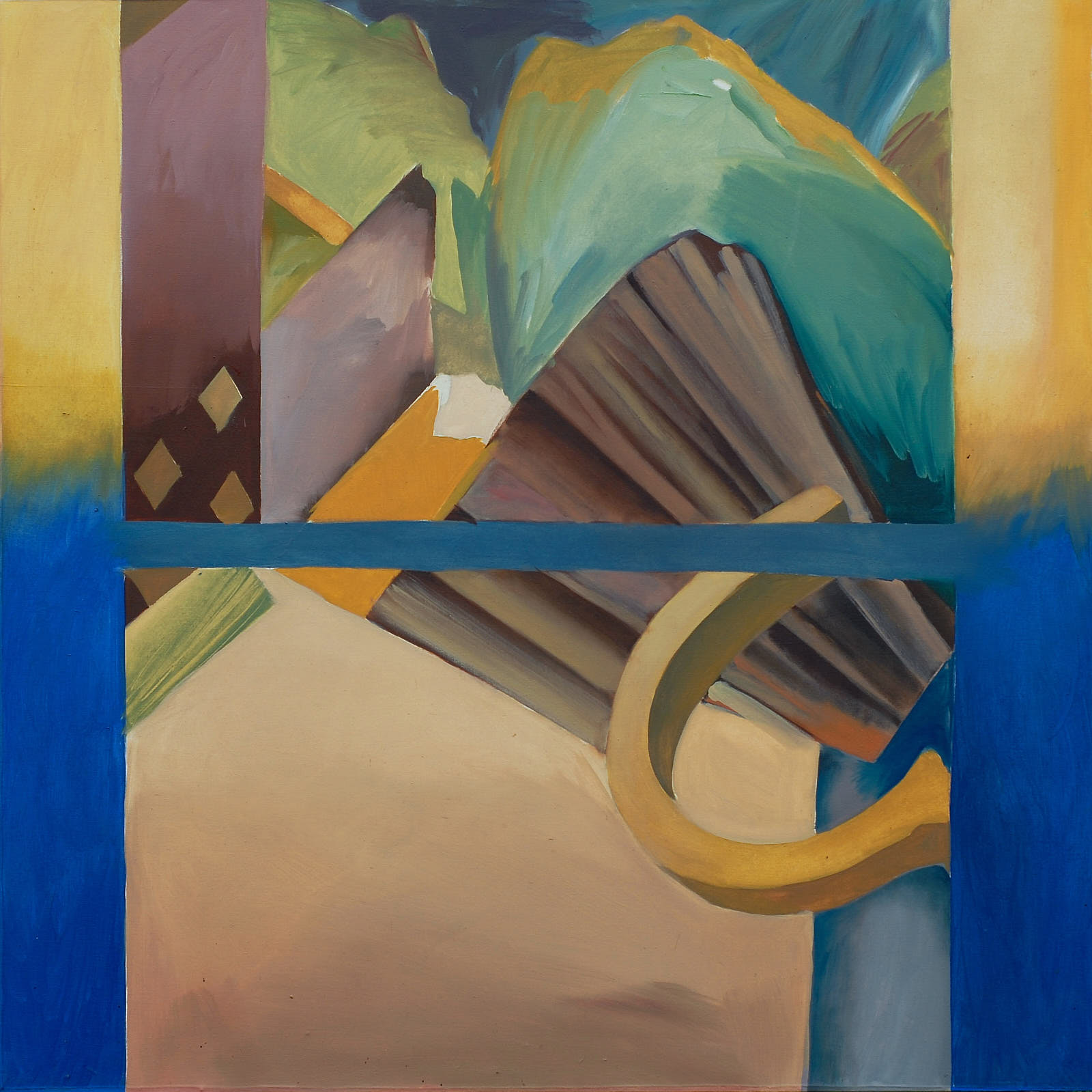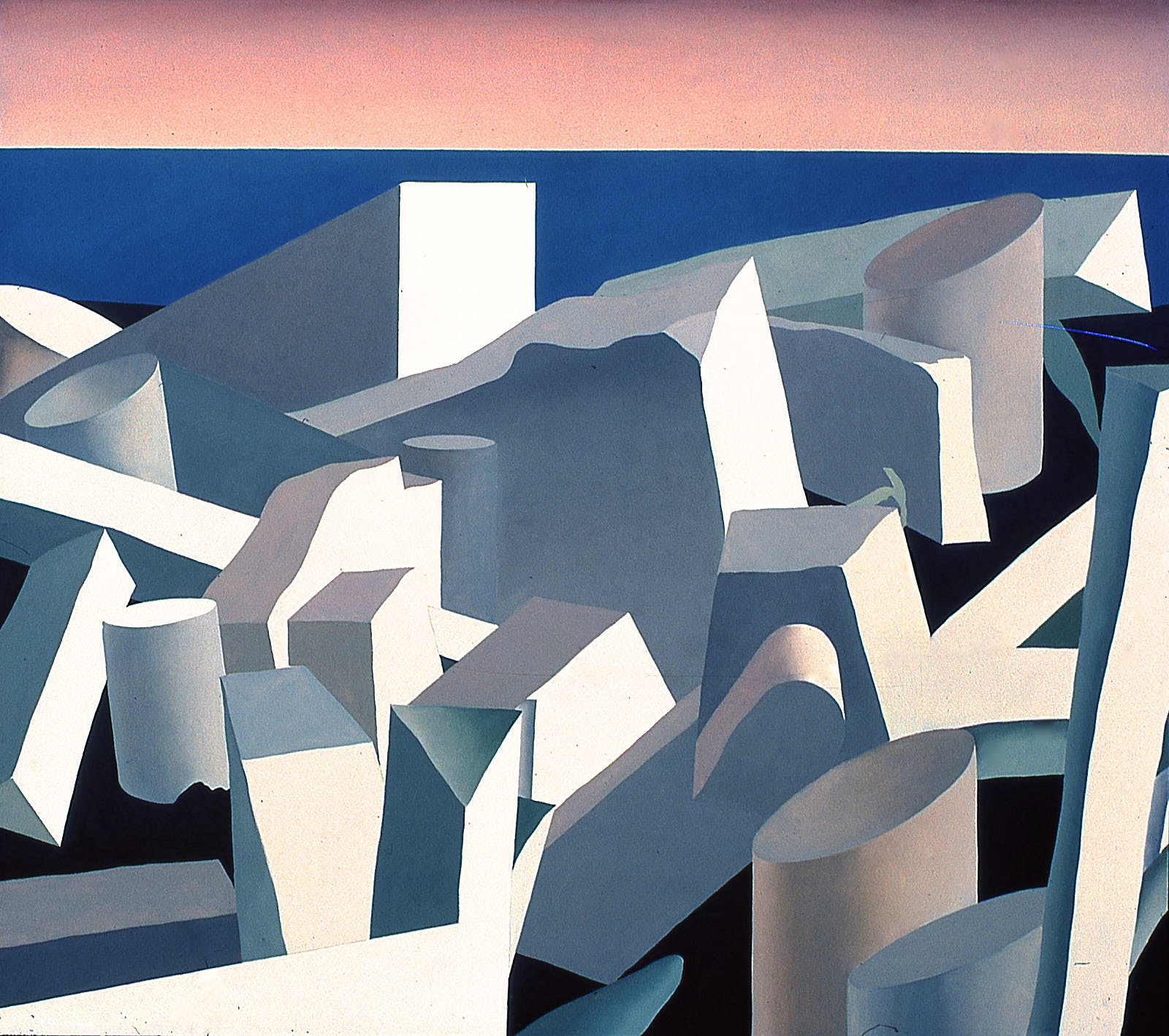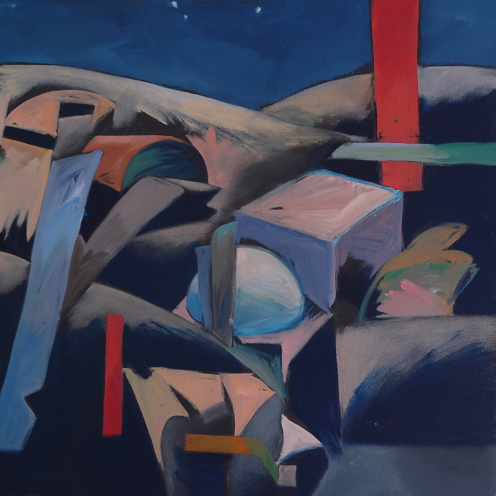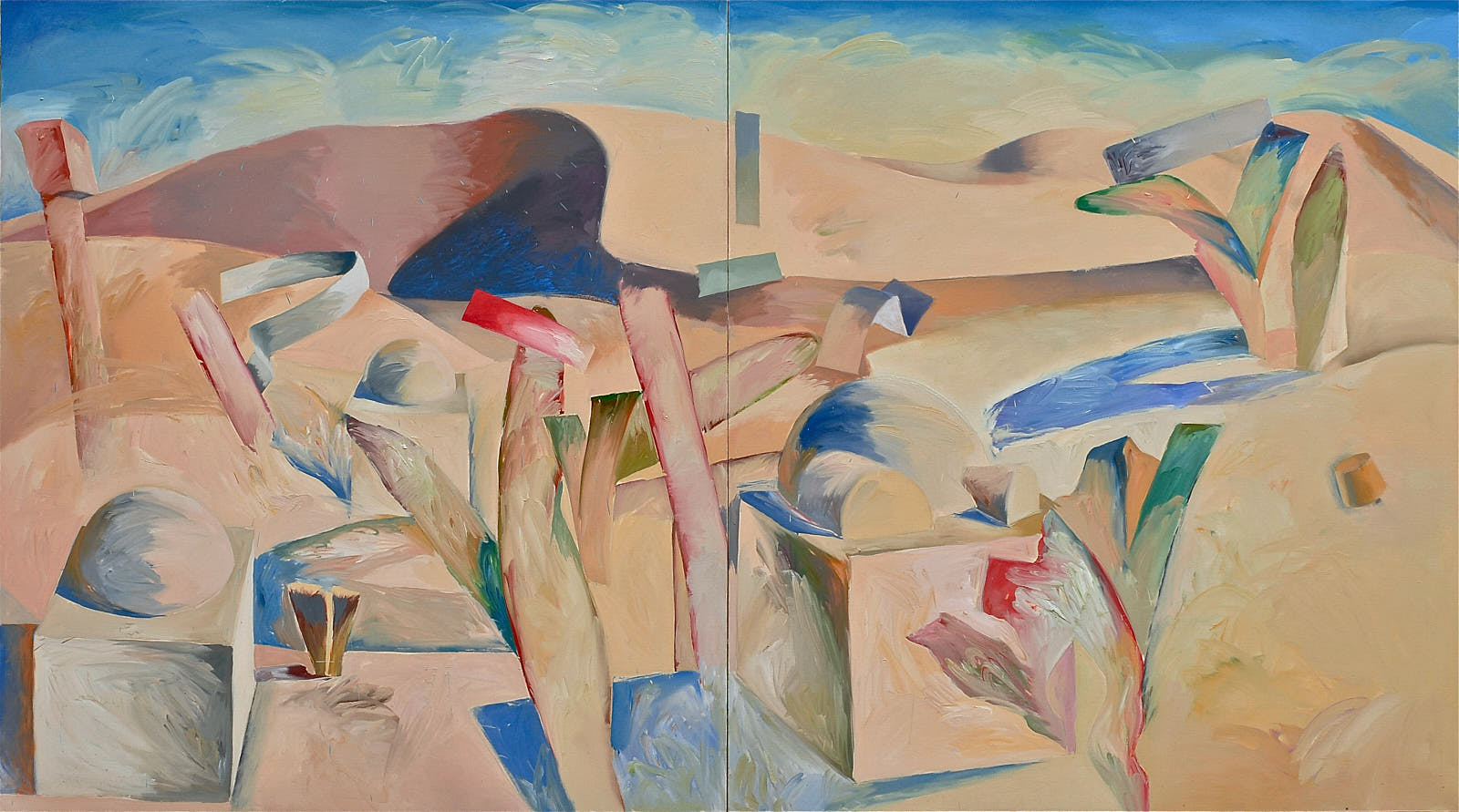 “His earliest landscapes are pictures from the West Coast made during Shank’s time living in San Francisco. Interested in perspective and spatial considerations, these works reflect nuances of location that are fragmented and abstract in presentation. Shank’s signifiers become more literal overtime, as his interest in the form of nature (specific flora and fauna) and cubism become increasingly evident in ‘San Francisco Bay with Iceplant’ (1972) and ‘The Sonora Desert at Ajo’ (1973).”